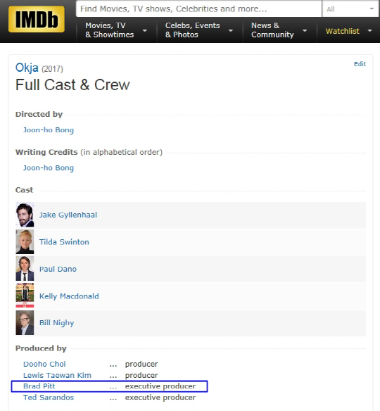최근 영화 전문 사이트 IMDB에는 '옥자'에 대한 정보가 업데이트됐다. 지난 10일 미국 영화계 신흥강자로 떠오른 넷플릭스(Netflix)사가 투자사로, '월드워 Z', '킥 애스' 시리즈, '노예 12년' 등을 제작하면서 중견 제작사로 떠오른 플랜 B 엔터테인먼트(Plan B Entertainment)가 공동 제작사로 합류한다는 소식이 전해진 이후 캐스팅과 제작진의 크레딧이 올라온 것.