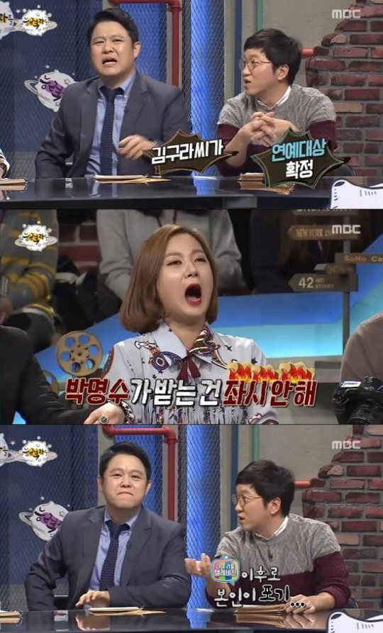 그러자 김구라는 "아니다"며 손사래를 쳤지만 이내 "하지만 박명수가 받는 것은 좌시하지 않겠다"고 너스레를 떨었다.