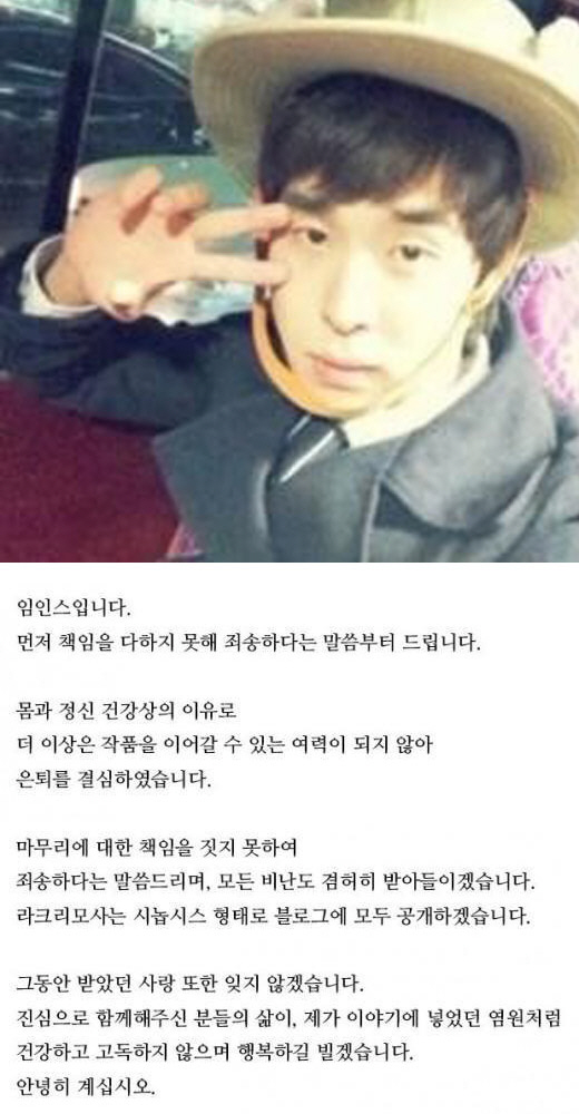 그는 공지를 통해 "먼저 책임을 다하지 못해 죄송하다"며 "몸과 정신 건강상의 이유로 더 이상 작품을 이어갈 수 있는 여력이 되지 않아 은퇴를 결심했다"고 밝혔다.