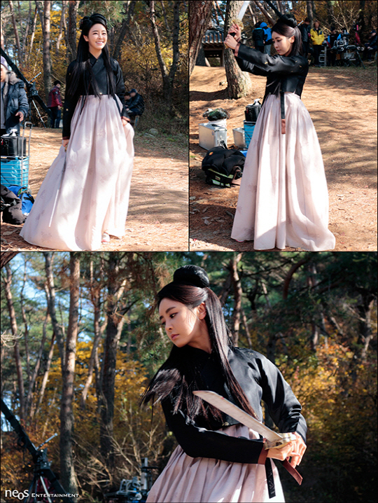공개된 사진 속 정유미는 극 중 그녀의 배역인 연희의 모습으로 완벽 변신한 채 촬영 소품으로 준비된 장검을 들고 수줍은 듯 해맑게 웃고 있다.