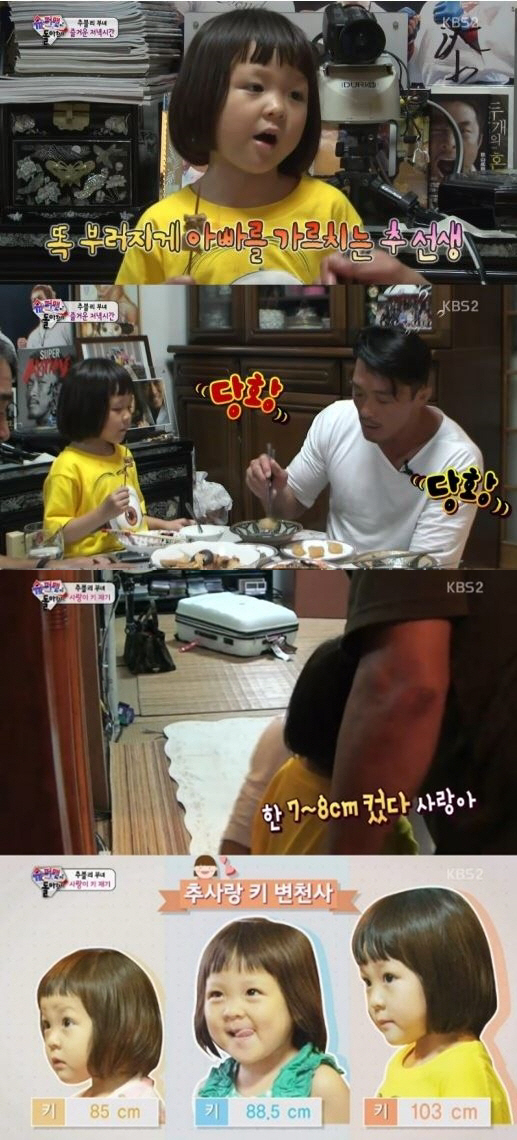 추성훈은 UFC 서울 경기 출전을 위해 2주간 프로그램 휴식을 선택한 바 있다. 파일럿 프로그램 시절부터 '슈퍼맨이 돌아왔다' 얼굴 간판이 되어온 추부녀의 휴식 소식은 많은 이들을 서운하게 했다. 하지만 약속대로 돌아온 추사랑은 몸도 마음도 한층 성장한 꼬마 숙녀로 자라있어 흐뭇함을 더했다.