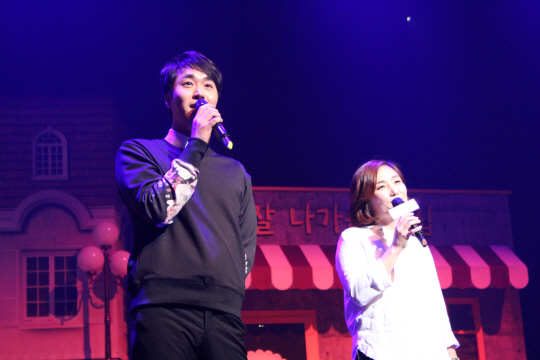 박경림이 14일 부산 해운대 센텀시티 소향아트홀에서 열린 토크콘서트 '여자의 사생활' 무대에 올라 게스트 조성모와 이야기를 나누고 있다. 사진제공=코엔스타즈