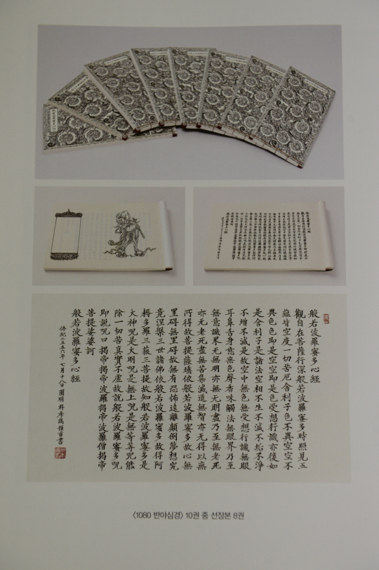이번 전시는 작가의 첫 개인전이자 김경호 회장으로부터 가장 먼저 받은 과제인 '반야심경' 사경의 결실이다. 반야심경을 1080번 쓴 것을 108개씩 묶어 2권은 족자형태로 표구했고, 8권은 책으로 묶었다. '반야심경' 외에도 틈틈이 사경한 보왕삼매론, 천수경, 신심명 등 다양한 사경 작품 40여 점을 만날 수 있다. '금강경'은 병풍으로 표구했다.