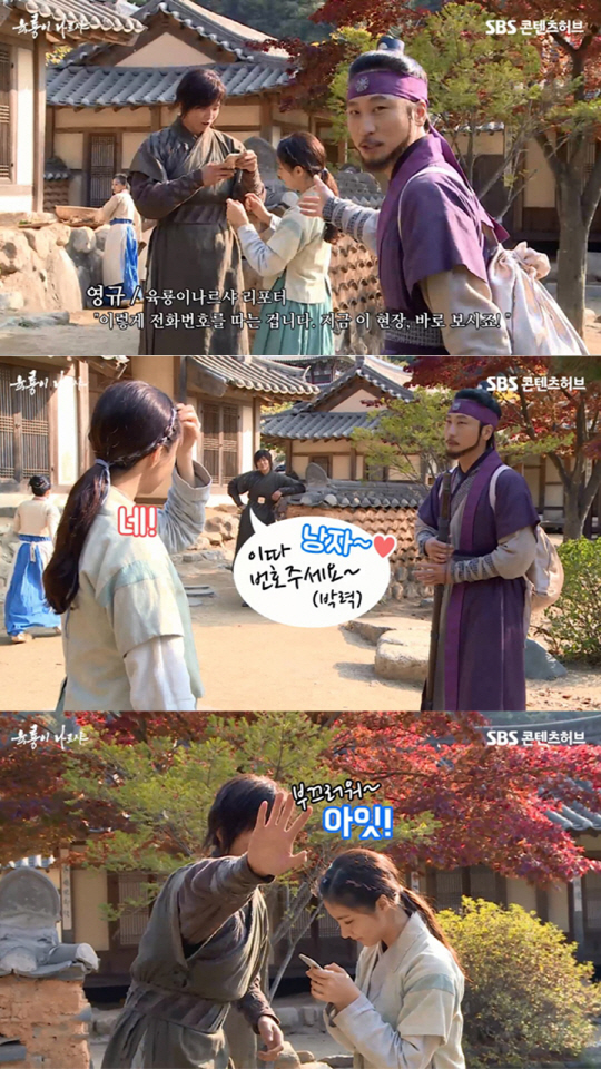 이때 윤균상이 신세경을 향해 "낭자 이따 번호주세요"라며 박력있게 말했는데, 이에 신세경은 "네. 지금 드릴까요?"라며 곧바로 그에게 다가가 그의 휴대전화에 자신의 번호를 찍는 모습이 이어졌다.