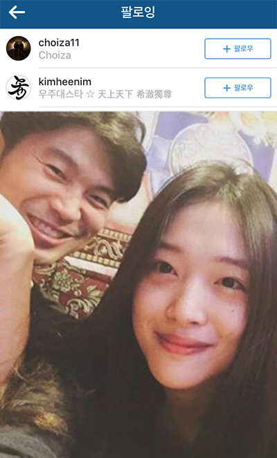 앞서 설리는 이날 자신의 SNS에 다이나믹 듀오의 8집 '그랜드 카니발'(GRAND CARNIVAL) 수록곡 '겨울이 오면' 음원 캡처 사진을 올리며 "듣자마자 눈물이 나오던 곡. 드디어 나왔다"라는 글을 적으며 남자친구 최자를 위해 적극적으로 홍보에 나섰다. 또 설리의 인스타그램 팔로잉에는 의남매로 알려진 김희철과 최근 인스타그램 계정을 만든 연인 최자까지 단 두 명만 추가돼 눈길을 끌고 있다.