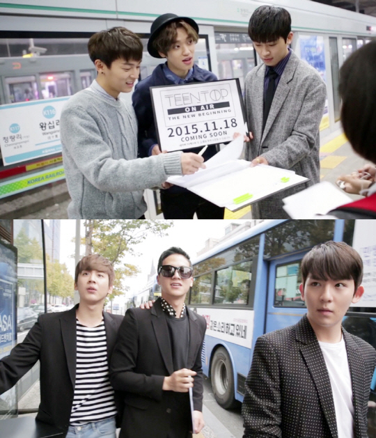 특히 거리로 나선 틴탑의 이색적인 모습과 함께 '틴탑이 떴다! 틴탑이 지하철과 버스에 나타난 이유는? 11월 18일 수요일 저녁 6시! #틴탑 ON AIR THE NEW BEGINNING 에서 밝혀 집니다. Coming soon!' 이라는 메시지가 함께 공개돼 틴탑이 대중교통을 타고 팬들을 만난 이유에 대해 궁금증을 야기 했다.