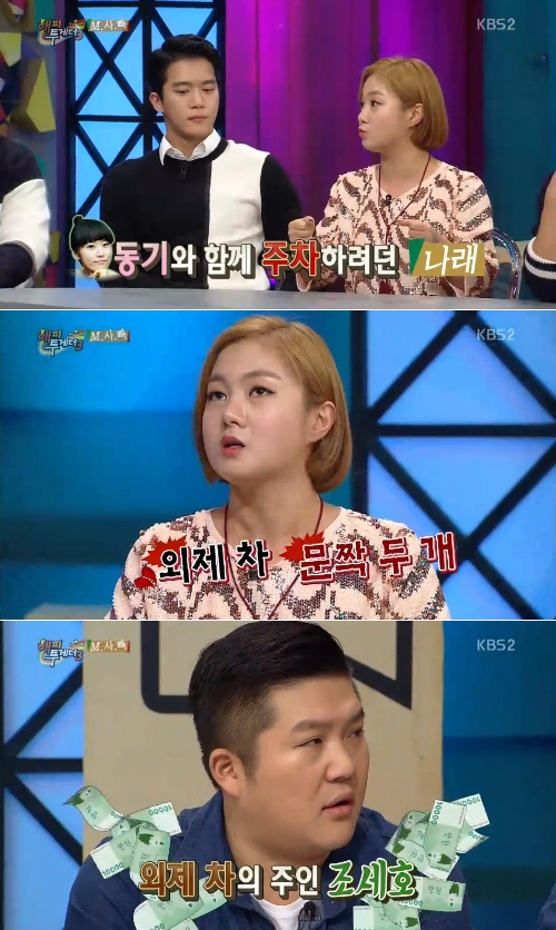 이날 박나래는 "과거 개그우먼 김경아가 초보운전이어서 주차를 뒤에서 봐주고 있었는데 김경아가 주차된 벤츠 문짝을 두개를 긁었다"고 당시 상황을 설명했다.