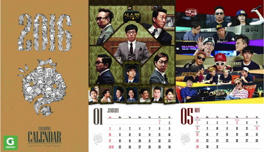 G마켓은 MBC TShop와 함께 19일 정오부터 '2016 무한도전 달력'을 판매를 시작했다. 이번 시즌 달력은 '탁상형 달력'(4000원), '벽걸이형 달력'(5000원) 총 2종으로 제작됐으며 탁상용 달력은 2015년에 방송된 무한도전을 주제로 앞면은 포스터, 뒷면은 일러스트 형태로 디자인됐다. 특히 뒷면 일러스트에는 최근 인기를 끄는 컬러링 방식을 도입했다. '무한도전 다이어리'(1만5000원)도 함께 예약 판매했다. 색상을 달리하여 2가지 종류로 제작되어, 무한도전 인기 에피소드를 배경으로 한 맴버들의 다양한 모습이 담겨있다.