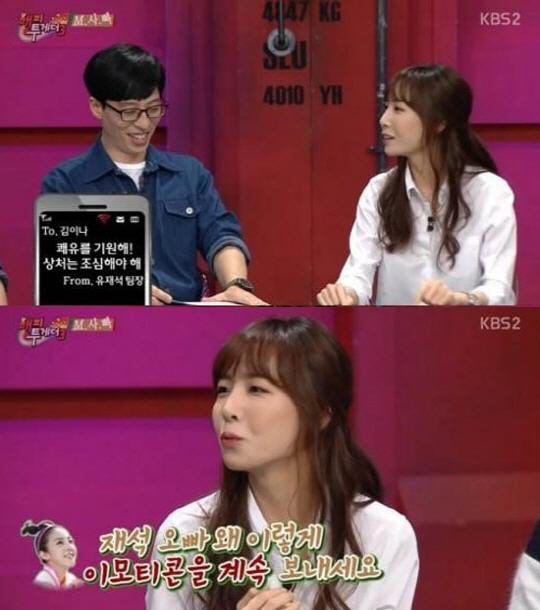 이어 "세번째 녹화를 마치고 메시지를 보냈는데 답장이 없더라. 녹화하고 발을 다친 후 '쾌유를 기원해. 상처를 조심해야해'라는 건조한 메시지가 왔다"라는 김이나는 "그런데 산다라박이 유재석에게 '왜 이렇게 이모티콘을 보내세요'라고 하더라"며 서운함을 털어놨다.