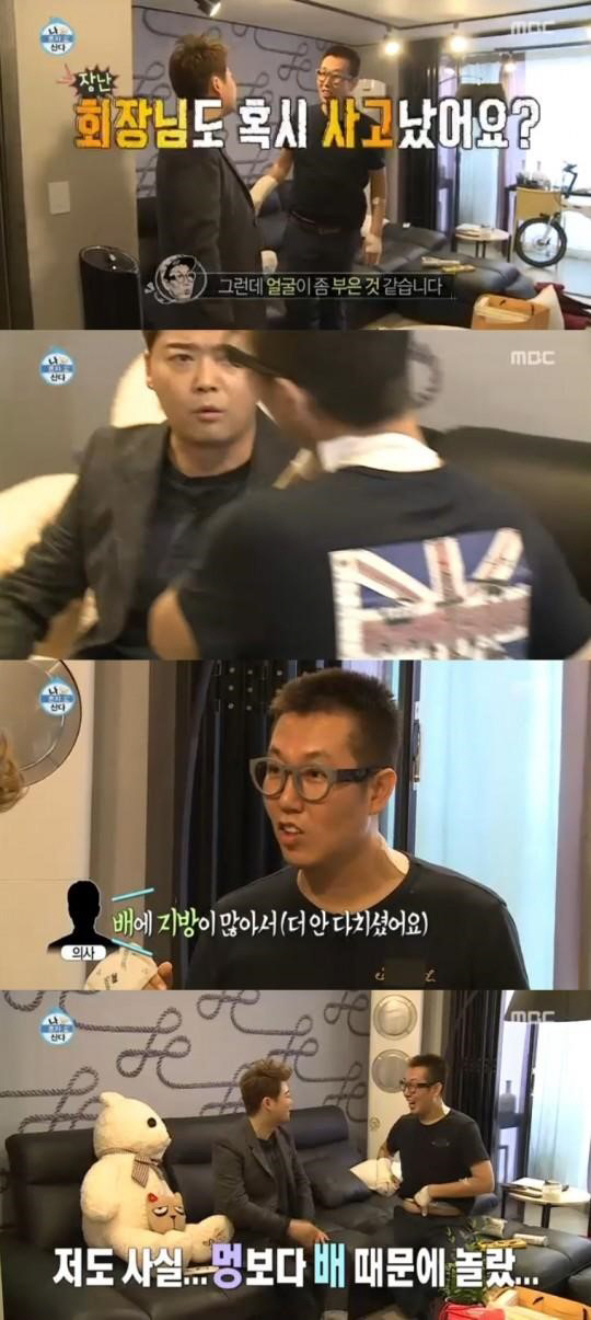 김영철은 "의사 선생님이 배에 지방이 많아서 덜 다쳤다고 하더라"고 말했고, 전현무는 "나도 정말 놀랐다. 멍보다 뱃살에 놀랐다"고 털어놔 폭소케 했다.
