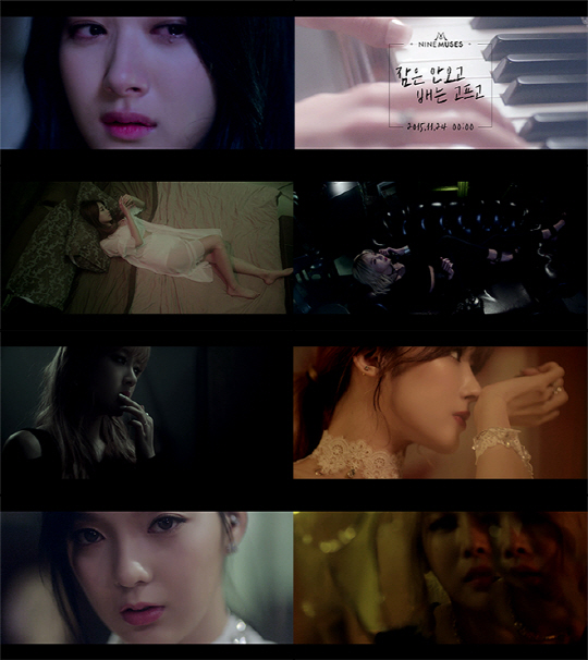 소속사 스타제국은 21일 자정 나인뮤지스 공식 유튜브 채널을 통해 신곡 '잠은 안오고 배는 고프고' 티저 영상을 공개했다. 공개된 영상에서 멤버들은 각자의 공간에서 이별을 겪은 여자의 모습을 표현했다. 데뷔 이후 처음으로 드라마 타이즈 형식의 뮤직비디오를 공개하며 색다른 변신을 예고한 것.