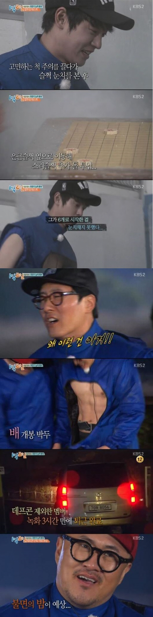 1라운드는 돌림판. 돌림판을 돌려 당첨된 부위를 떼어냈다. 2라운드는 강풍기 앞에서 라면 빨리 먹기. 멤버드은 '돌돌 말아먹기 없음', '그릇 높이는 명치 부근'이라는 등 자기들끼리 더 엄격한 룰을 만들어내며 서로를 견제했다. 덕분에 라면 면발은 멤버들의 얼굴을 휘감으며 복병으로 작용, 큰 웃음을 선사했다. 3라운드는 냉동창고에서 알까기. 정준영은 다섯 알이 아닌 여섯 알로 게임을 시작하는 잔머리를 발휘해 승리를 거머쥐었다. 결국 꼴찌는 김주혁과 데프콘으로 정해졌다. 유호진PD는 둘 중 야외취침을 할 멤버를 정하기 위해 돌림판을 돌렸고 데프콘이 야외취침자로 최종 결정했다. 다른 멤버들은 녹화 시작 3시간 만에 조기퇴근, 빅재미를 안겼다.
