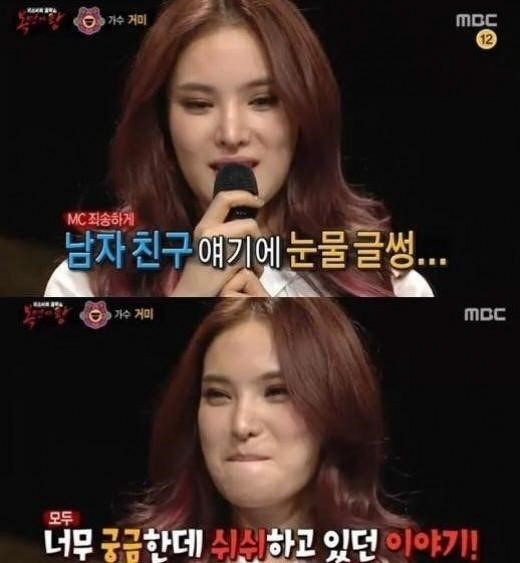 가수 거미가 남자친구인 배우 조정석이 언급되자 자신도 모르게 눈물을 흘렸다.
