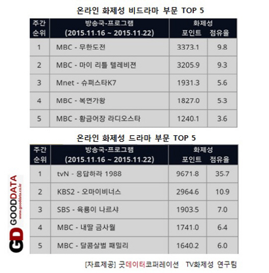 TV 화제성 분석 기관 굿데이터코퍼레이션(gooddata.co.kr)의 2015년 11월 4주차 분석 결과, 비드라마 부문에서 무한도전이 화제성 점유율 9.8%로 1위를 차지했으며 '마리텔'은 9.3%로 2위를 차지했다. 또한 드라마 부문에서는 유재석 출연 효과로 '내딸금사월'이 4위를 차지했다. 이는 지난주 10위에서 6계단 오른 순위이며 평소 화제성의 3배 가까운 상승하여 자체 최고 기록이다. <스포츠조선닷컴>