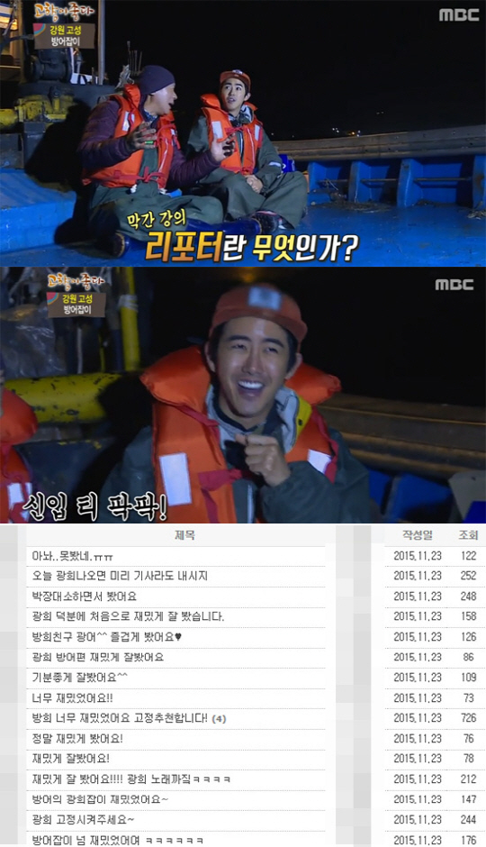 이날 광희는 23년차 리포터 정진수와 완벽한 호흡을 자랑했다. 광희는 발랄하면서도 진지한 자세로 방어 잡이 작업에 임했고, 중간 중간 예능감 역시 선보이며 웃음을 놓치지 않았다.