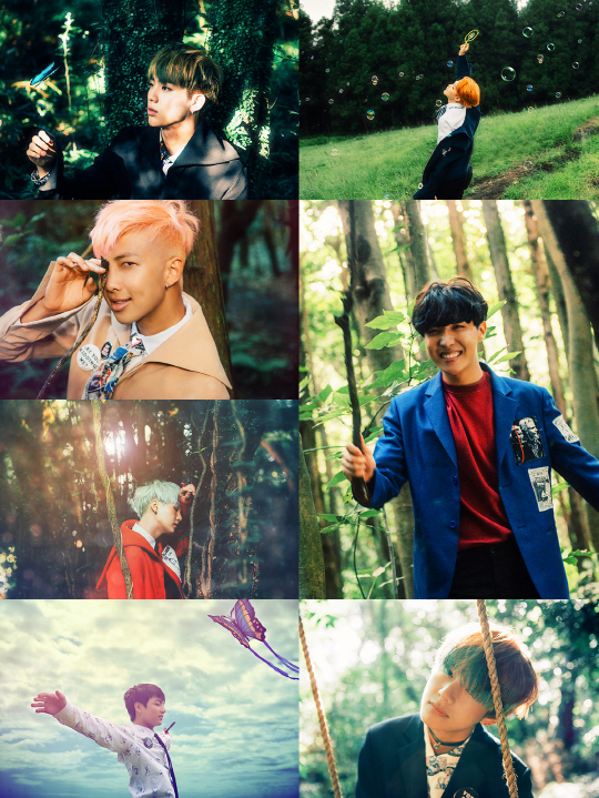 'Papillon(나비)'를 주제로 한 사진 속 방탄소년단은 푸른 들판 위를 맨발로 뛰어 놀며 마치 꿈 속에서나 볼 수 있을 것 같은 행복한 미소를 짓고 있다.