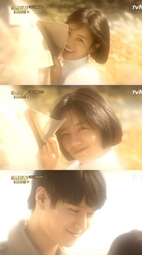 이미연처럼 깜찍하고 상큼한 매력을 뽐낸 덕선은 자신에게 품을 빌려준 선우(고경표)를 바라보며 수줍은 미소를 지어 보였다.