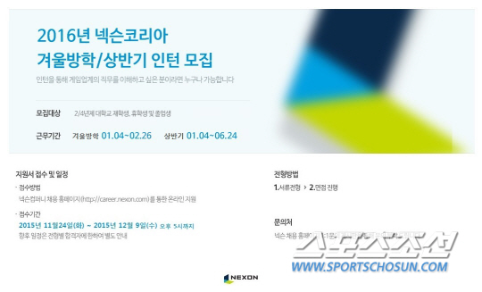 넥슨은 올 겨울방학(단기) 및 2016년 상반기(장기) 인턴사원 공개 채용을 진행한다고 25일 밝혔다.