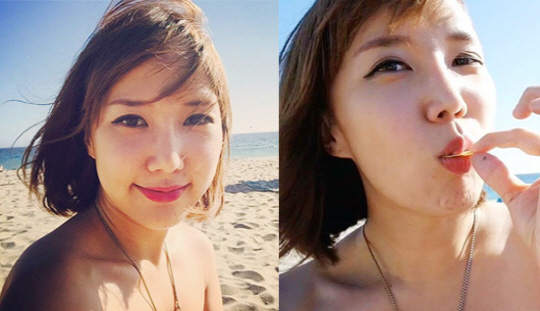 공개된 사진 속 국가비는 바다를 배경으로 모래 사장 위에 앉아 옅은 미소를 짓고 있다.
