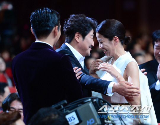 한국 영화 최고의 권위를 자랑하는 '제36회 청룡영화상' 시상식이 26일 서울 경희대학교 평화의 전당에서 열렸다. 여우조연상을 수상한 전혜진이 송강호와 유해진의 축하를 받고 있다. 정재근 기자 cjg@sportschosun.com/2015.11.26/