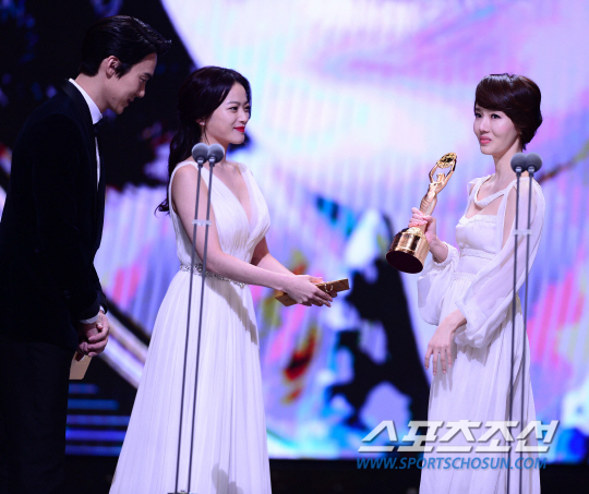 한국 영화 최고의 권위를 자랑하는 '제36회 청룡영화상' 시상식이 26일 서울 경희대학교 평화의 전당에서 열렸다. '청룡영화상'은 1963년 처음 개최된 이래 한국영화 산업의 찬란한 발전에 기여하며 가장 신뢰받는 대한민국 최고의 영화상으로 자리매김했다. 특히 올해 시상식은 역대 최강급 후보들이 포진해 있어 불꽃튀는 접전이 예상된다. 여우주연상을 수상한 '성실한 나라의 앨리스'의 이정현이 전년도 수상자 천우희에게 트로피를 받고 있다. 경희대=조병관 기자 rainmaker@sportschosun.com