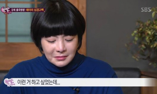 또한 에이미는 미국에서의 생활에 대해 "무엇을 할 지 아직 생각해보지 않았다. 생각이 나지도, 하고 싶지도 않다. 그냥 막막하다. 미국에가서 잘 살아보겠다는 생각도 들지 않는다"며 "한국이 날 버렸다는 느낌이 든다. 내 나라에서도 나를 버렸는데, 과연 내가 다른 나라에서 잘 살 수 있을지 모르겠다"고 털어놨다.