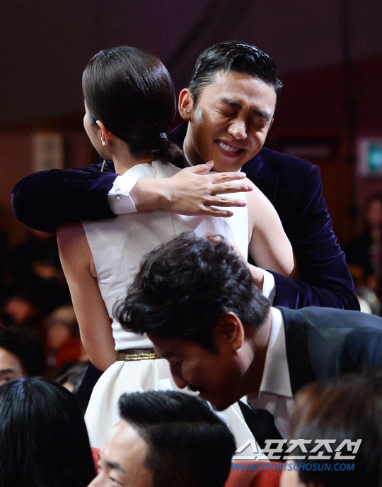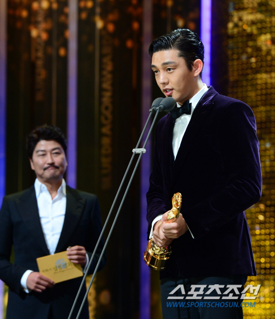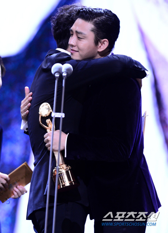 충무로에서 둘째가라면 서러운 배우들이 노미네이트된 상황에 수상은 언감생심 엄두도 못 냈을 유아인. 자신이 주인공으로 호명되자 두 눈을 질끈 감은 유아인은 어찌할 줄 모르며 선배 배우들을 향해 90도 인사를 거듭했다. 11년 차, 첫 남우주연상이었다. 무대에 오른 유아인은 지난해 남우주연상을 수상한 송강호로부터 트로피를 건네받았고 뜨거운 포옹으로 마음을 대신했다.