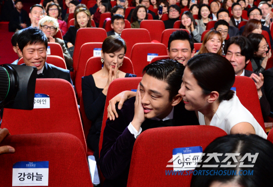 한국 영화 최고의 권위를 자랑하는 '제36회 청룡영화상' 시상식이 26일 서울 경희대학교 평화의 전당에서 열렸다. '청룡영화상'은 1963년 처음 개최된 이래 한국 영화산업의 찬란한 발전에 기여하며 가장 신뢰받는 대한민국 최고의 영화상으로 우뚝섰다. 특히 올해 시상식은 역대 최강급 후보들이 포진해 있어 불꽃튀는 접전이 예상된다. 여우조연상을 차지한 배우 전혜진이 유아인의 축하를 받고있다. 경희대=최문영 기자 deer@sportschosun.com /2015.11.26/