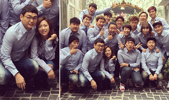 사진에는 박영진과 예비신부의 웨딩촬영을 위해 모인 KBS 개그맨들이 함께 나란히 청바지에 셔츠를 맞춰 입고 단체로 포즈를 취한 모습이 담겨 있다. 맨 앞에 나란히 앉은 박영진과 미모의 신부는 행복한 미소를 짓고 있는 모습. 또 이상훈, 김영희, 오나미, 김기리, 송영길 등 의리 가득한 개그맨들의 모습이 눈길을 끈다.