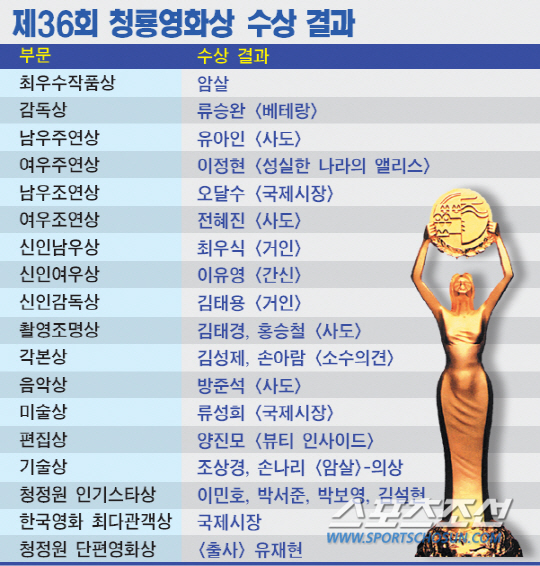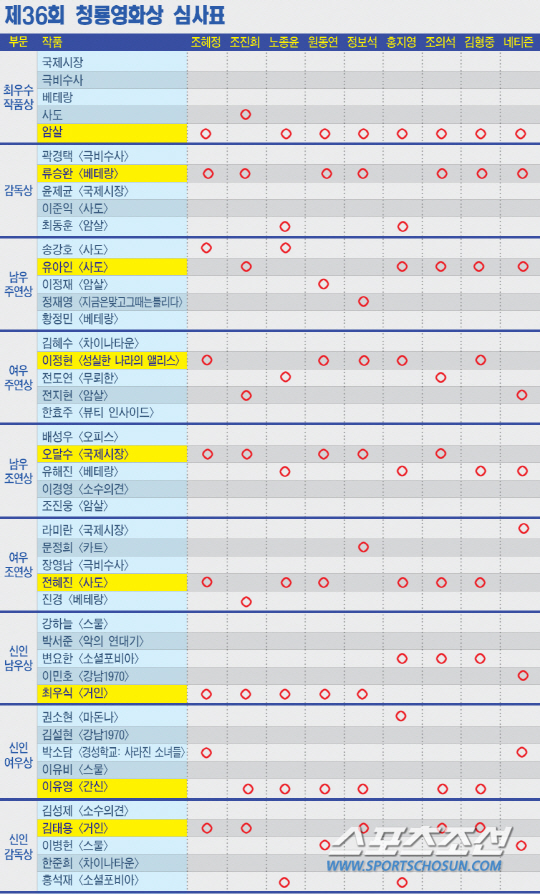 ※심사위원 명단 : 조혜정(교수·중앙대 예술대학원), 조진희(교수·숙명여대 미디어학부), 노종윤(제작자·웰메이드필름 대표이사), 원동연(제작자·리얼라이즈픽쳐스 대표이사), 정보석(배우), 홍지영(영화감독), 조의석(영화감독), 김형중(스포츠조선 엔터테인먼트팀 부장), 네티즌 투표