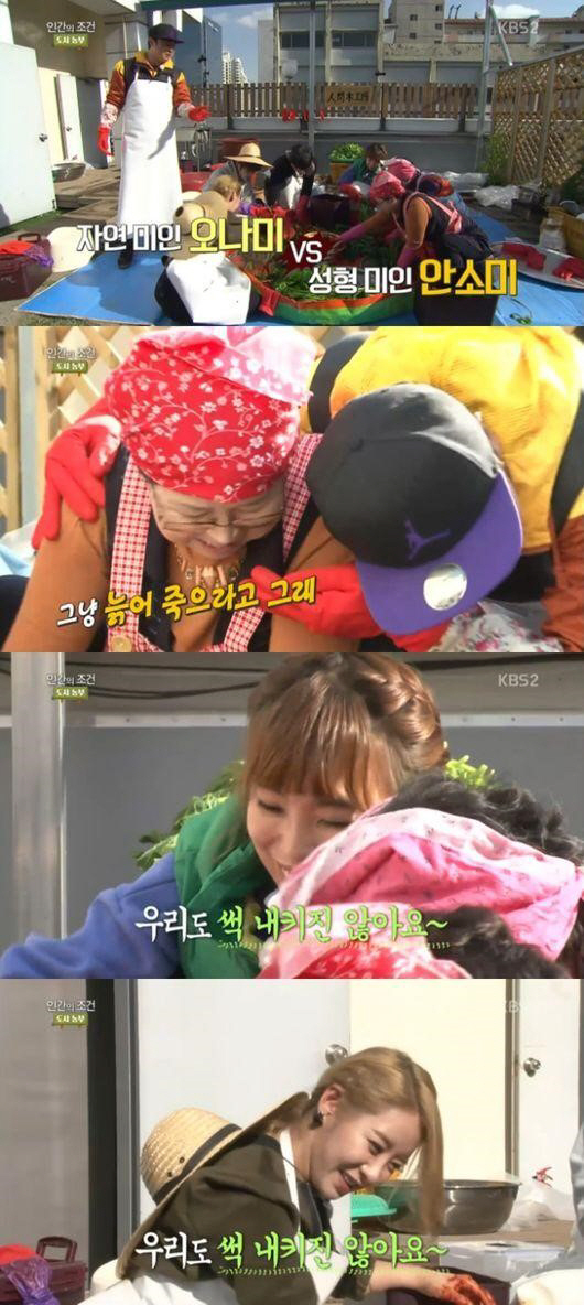 27일 방송된 KBS2 예능프로그램 '인간의 조건-도시농부' 편에는 개그우먼 안소미 오나미가 김장을 도우러 왔다.