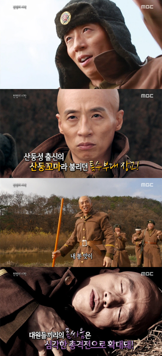 이날 유재석은 목봉술에 능한 산둥성 출신의 '산둥꼬마'라 불리던 특수부대 장교 역으로 출연했다. 민머리에 봉을 들고 나타난 유재석은 소련군의 "메뚜기 같이 생긴 게 힘이나 쓰겠냐"는 빈정거림에도 주특기인 현란한 목봉술로 상대를 제압했다. 하지만 유재석은 소련군의 총을 맞고 그 자리에서 사망했다.