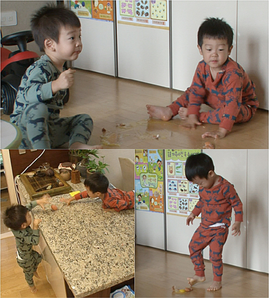 서준은 서언에게 달려가 계란을 보여줬다. 서언-서준은 계란을 사이에 두고 의미심장하게 눈빛 교환을 나눴고, 서준은 서언과 맘이 통한 걸 확인한 후 의기양양하게 방 바닥에 계란을 투하했다. 서언-서준은 바닥에 깨진 계란을 보곤 행복한 듯 함박웃음을 터트렸고 계란팩을 하듯 온 몸을 계란 범벅으로 만들어시선을 집중시켰다.
