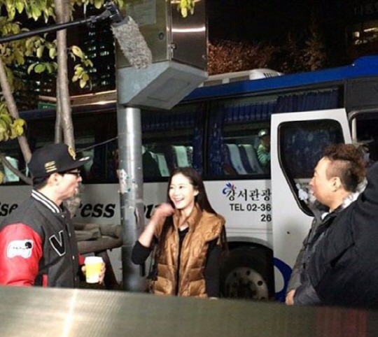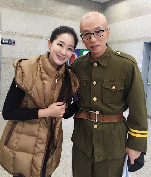 사진에서 김하영은 민머리 분장을 한 유재석과 나란히 서서 포즈를 취했다. '서프라이즈'에서 중국군으로 등장한 유재석은 민머리에 군복을 입은 모습 그대로 기념 촬영에 응해 눈길을 끈다.