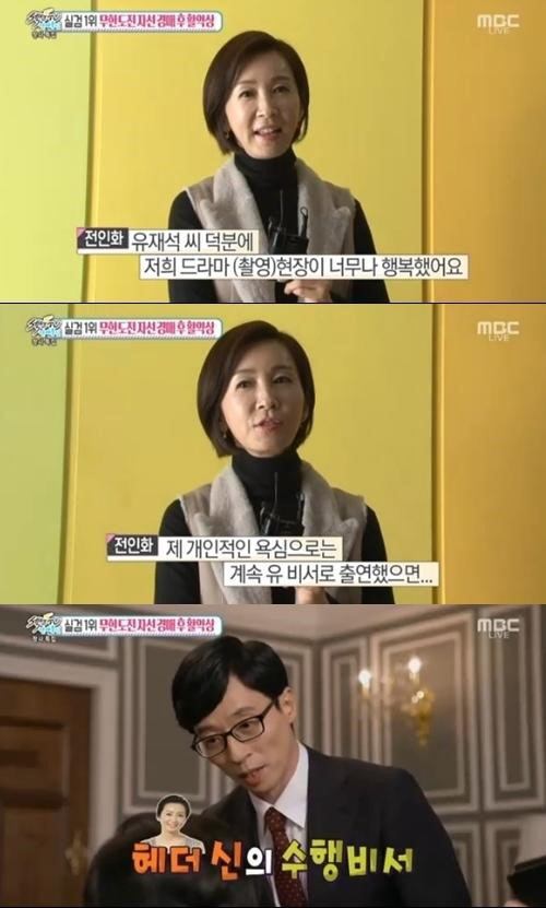 이날 유재석과 호흡을 맞춘 전인화는 "유재석 씨 덕분에 드라마 현장이 정말 행복했다. 나는 NG를 안 내려고 어금니를 꽉 물고 연기했는데 유재석 씨도 너무 진지하게 잘했다"고 극찬했다.