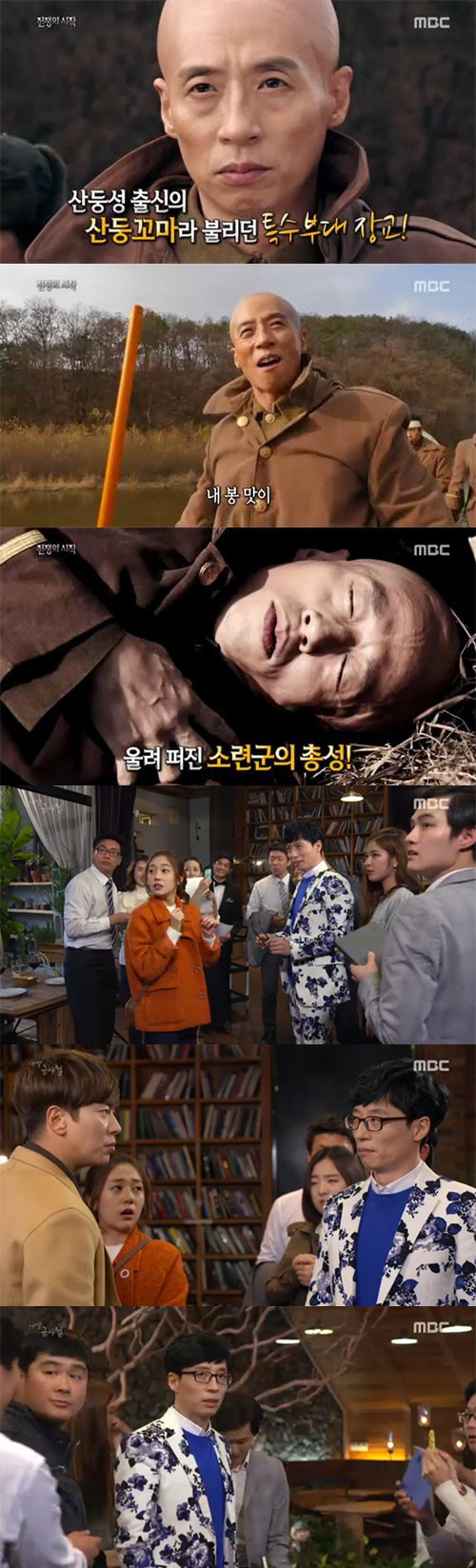 이날 유재석은 목봉술에 능한 산둥성 출신의 '산둥꼬마'라 불리던 특수부대 장교 역으로 출연했다. 민머리에 봉을 들고 나타난 유재석은 소련군의 "메뚜기 같이 생긴 게 힘이나 쓰겠냐"는 빈정거림에도 주특기인 현란한 목봉술로 상대를 제압했다. 하지만 유재석은 소련군의 총을 맞고 그 자리에서 사망했다.