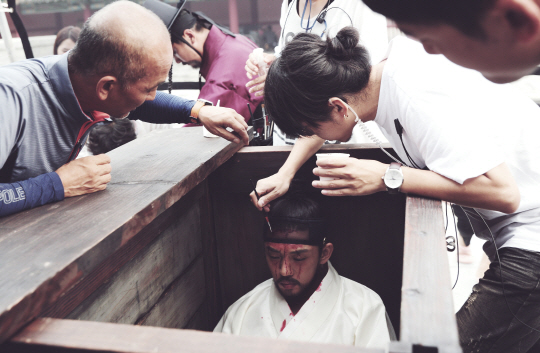 이준익 감독이 바라보고 있는 가운데, 뒤주에 갇힌 유아인이 조태희 실장으로부터 분장을 받고 있다. 사진제공=쇼박스