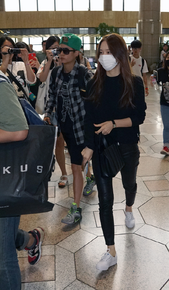 블랙 가죽 팬츠에 블랙 니트를 입은 크리스탈. 여기에 흰 마스크와 흰 스니커즈로 전체적인 컬러의 밸런스를 맞추었다. 블랙 앤 화이트 룩에서 절제할 컬러를 확실히 절제한 스타일이다. 전반적으로 심플하지만 포인트가 된 바디라인이 드러나는 가죽 소재 팬츠는 결코 아무나 따라할 수 없는 스타일이기도 하다.