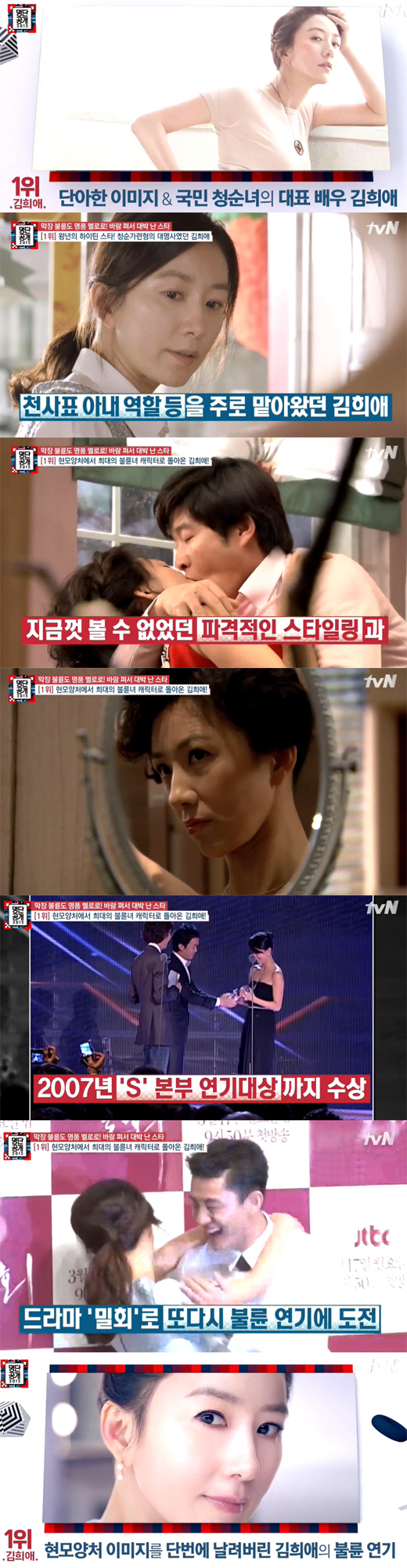 1위는 다름 아닌 현모양처의 대명사 김희애. 아이러니하게도 김희애는 두번의 파격적인 불륜 연기로 오히려 더 큰 사랑을 받는 스타로 거듭났다.