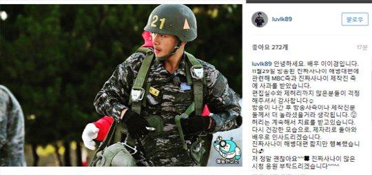 이이경은 "11월 29일 방송된 진짜사나이 해병대편에 관련해 MBC 측과 진짜사나이 제작진 측에 사과를 받았습니다"라며 "편집실수와 제 허리까지 많은 분들이 걱정해주셔서 감사합니다"고 밝혔다.