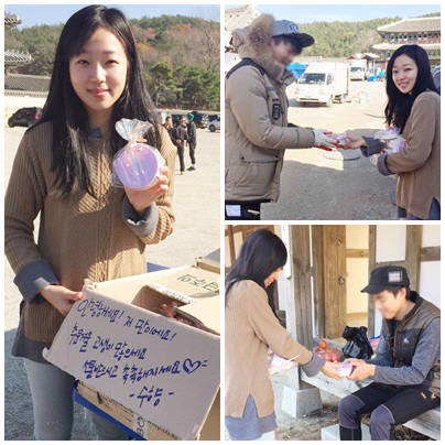 조수향은 "추운 날씨에 늘 함께 고생하는 동료 배우와 스태프에게 고마운 마음을 표현하고 싶었다. 건조한 겨울에 없으면 안될 제품이 바디케어 제품이라 생각해 준비했다"고 밝혔다.