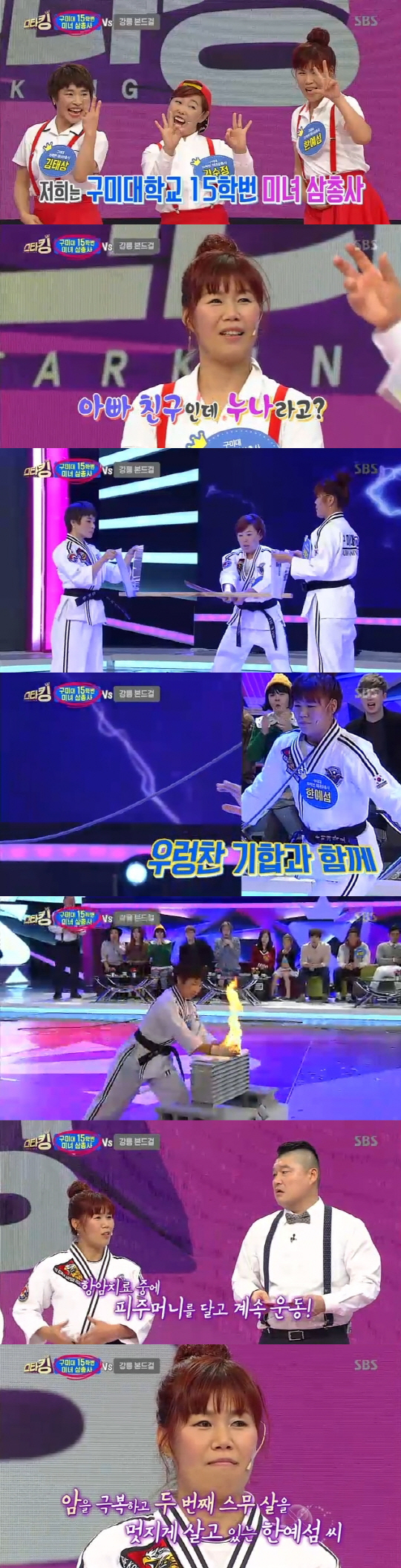 각목 격파, 목으로 철근 구부리기, 대리석 화공격파 등을 펼친 '미녀 삼총사'. 평균 나이 46세 중년 여성이라고는 믿기지 않을 강력한 힘을 과시했다.
