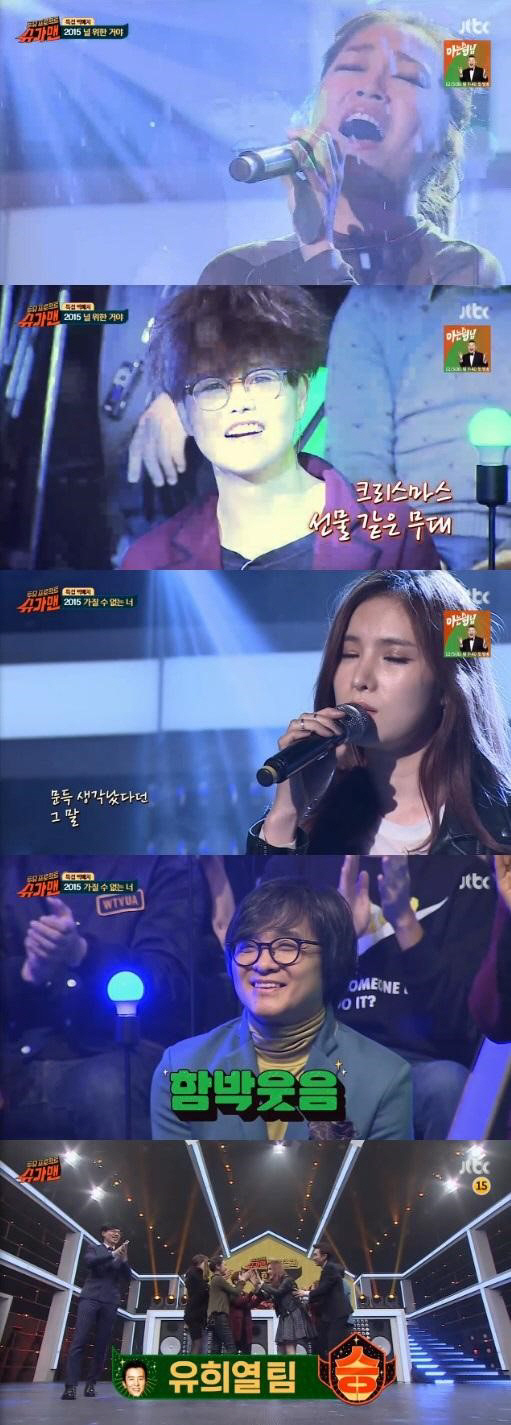 이후 투표 결과 40대에서는 13대12로 유재석팀이, 30대에서는 13대12로 유재석팀이, 20대에서는 10대15로 유희열팀이 각각 승리를 거뒀다. 그리고 10대 투표 결과에서 9대16으로 유희열팀이 압도적인 표를 거두면서 거미가 최종 승리의 주인공이 됐다. <스포츠조선닷컴>