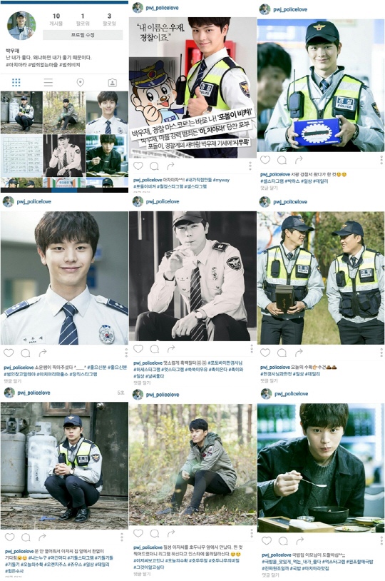 그는 "자신을 내이름은 우재, 경찰이죠"라며 경찰 마스코트처럼 포즈를 취한 것을 비롯해 자양강장제를 들고 있거나 우유를 마시고 있는 모습, 그리고 국밥을 먹는 모습도 공개했다. 무엇보다도 그는 '한우커플'로 활약해온 한경사(김민재 분)와 다정한 모습도 눈길을 끌고 있고, 아가씨 필성(최재웅 분)을 찍은 사진, 그리고 그를 만나기 위해 하염없이 기다리는 모습도 더불어 올린 것이다.