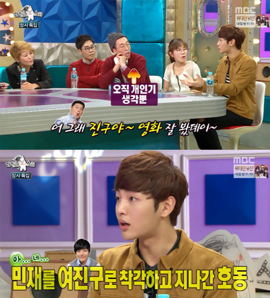 이날 김민재는 "어느날 방송국에서 우연히 강호동 선배님을 만났다. 그런데 저를 보고 '진구야 영화 잘 봤다'고 하고 가시더라. 그래서 달려가서 신인배우 '김민재 입니다'하고 인사를 드렸다"고 말했다.