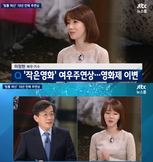 이날 손 앵커는 "기적. 이변. 승리. 지난주 청룡영화제에서 이분이 여우주연상을 받은 뒤 쏟아져 나온 말들이다"며 이정현을 소개했다.