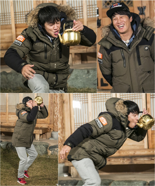 [스포츠조선 이유나 기자] '1박 2일' 차태현이 주전자와 운명적인 뽀뽀를 나누고 있는 모습이 포착돼 웃음을 유발하고 있다.