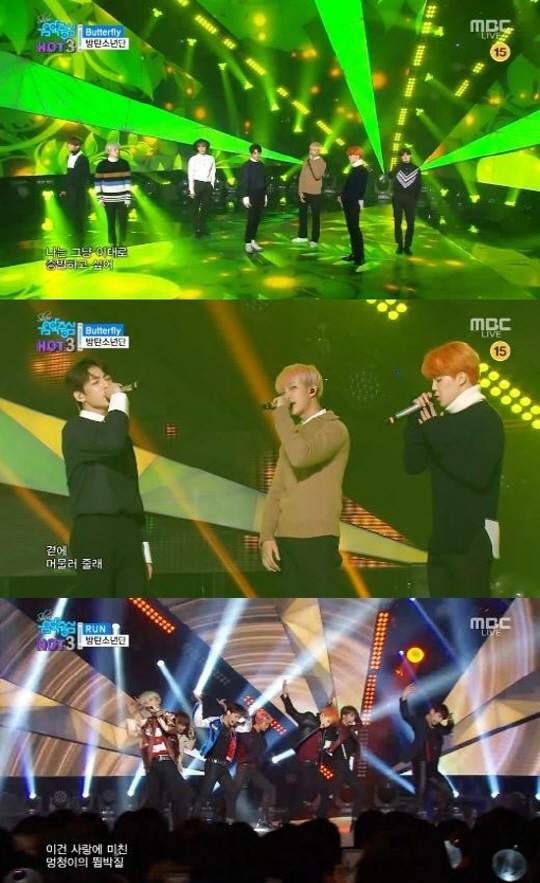 5일 오후 방송된 MBC '쇼!음악중심'에서는 방탄소년단이 '버터플라이(Butterfly)'와 '런(RUN)'을 열창했다.