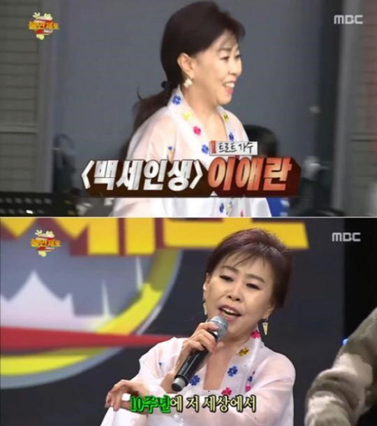 '무한도전'에 노래 '백세인생'으로 '~전해라' 신드롬을 일으키고 있는 트로트가수 이애란이 등장했다.