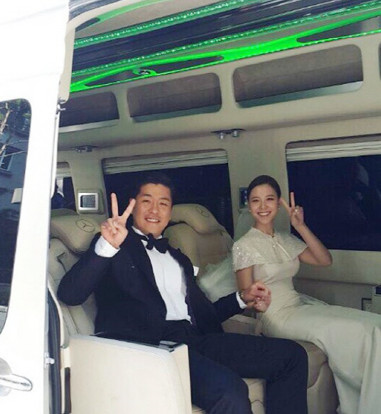 사진 속에는 각각 턱시토와 웨딩드레스를 곱게 차려 입은 강민호와 신소연이 카메라를 향해 환한 미소와 함께 브이 포즈를 하고 있는 모습이다.